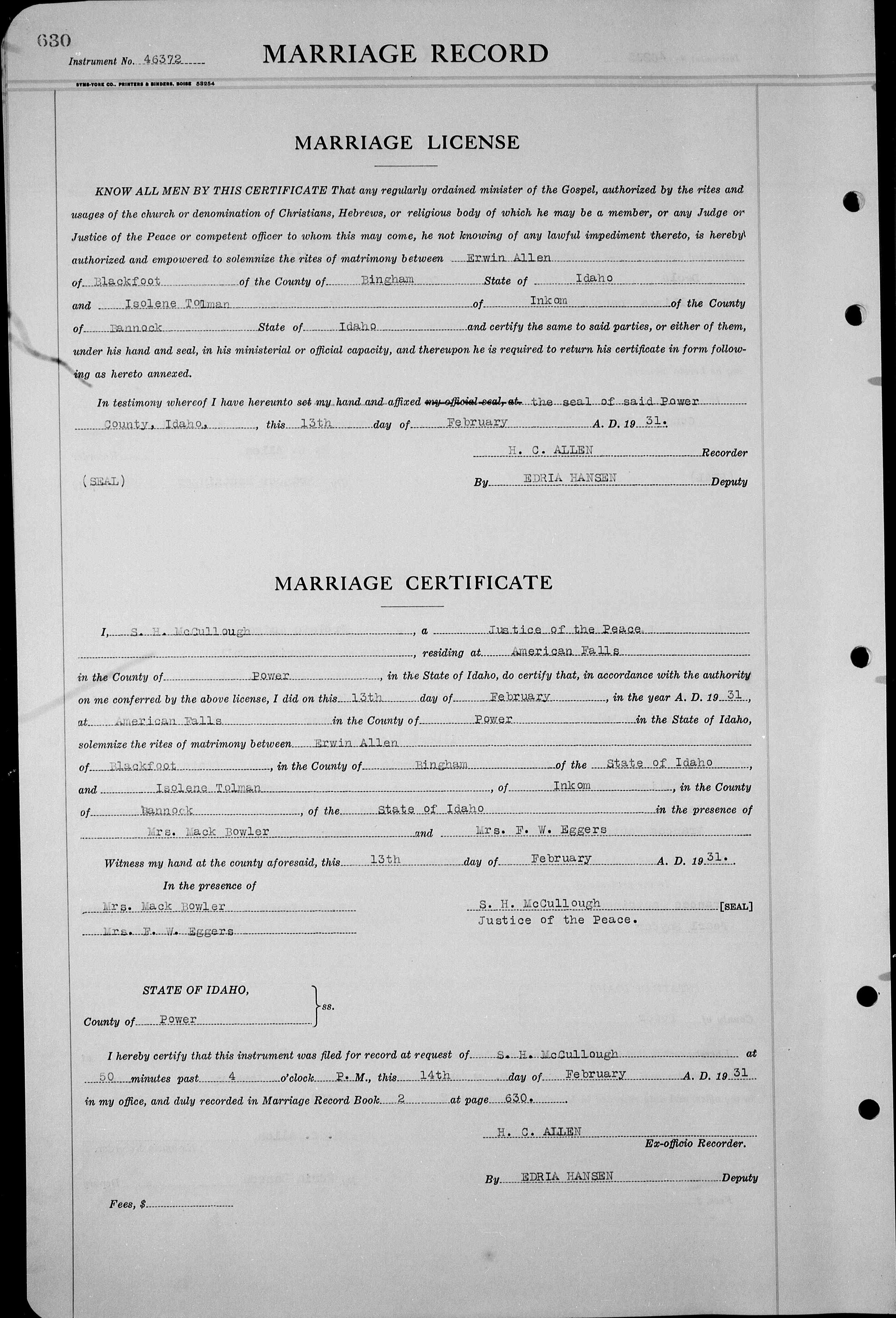 Erwin Allen and Isolene Tolman Wedding Record
